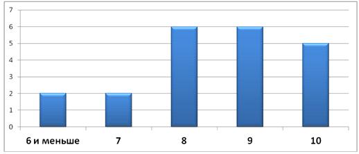 Судя по диаграмме к вопросу №5, можно утверждать, что лишь 5 респондентов из 21 готовы трудиться на 10 баллов из 10 возможных, чтобы добиться «жизненного успеха». Нежелание респондентов трудиться «во всю» ради достижения «жизненного успеха», возможно, говорит о нежелании трудиться вообще, лени, инфантильности, наивности или безответственности. 12 опрошенных готовы трудиться лишь на 8 и 9 баллов из 10-ти возможных. Также, судя по диаграмме можно с уверенностью утверждать, что ответы респондентов на данный вопрос полностью отвергают гипотезу №3 «большинство опрошенных готовы трудиться на все 10 из 10-ти, чтобы добиться «жизненного успеха».