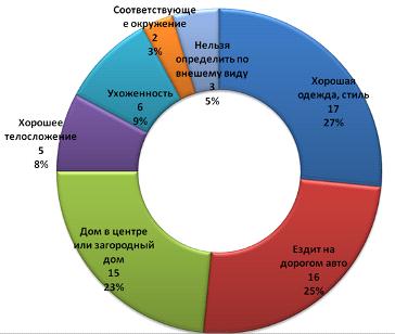 Внешними проявлениями «жизненного успеха» подавляющее большинство респондентов, считают хорошую доброкачественную или брендовую одежду, дорогое авто, дом в центре города или загородный дом, то есть о материальном достатке. По мнению троих респондентов, определить «жизненно успешного» человека по внешнему виду невозможно. Что может говорить о том, что для данных опрошенных, финансовое благосостояние не говорит о «жизненном успехе», возможно потому, что для них более ценны нематериальные ценности, такие как счастливая семья, хорошие взаимоотношения с друзьями, удовлетворение результатом своих действий, достижение целей и задач, власть, здоровье и пр.