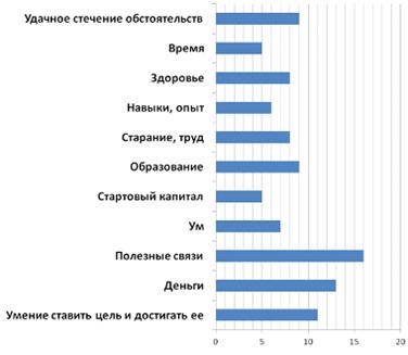 Судя по диаграмме, можно сказать, что для большинства опрошенных полезные связи, наличие денежных средств, умение ставить цель и достигать ее являются наиболее полезными факторами для достижения «жизненного успеха». Также для многих удачное стечение обстоятельств, наличие отличного образования, здоровье, сильное старание и труд являются полезными факторами для достижения «жизненного успеха».