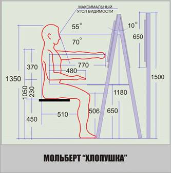 Конструкция мольберта разработана с применением антропометрических особенностей человека, возможность компактного хранения мольбертов обусловлена необычностью складывающего механизма.