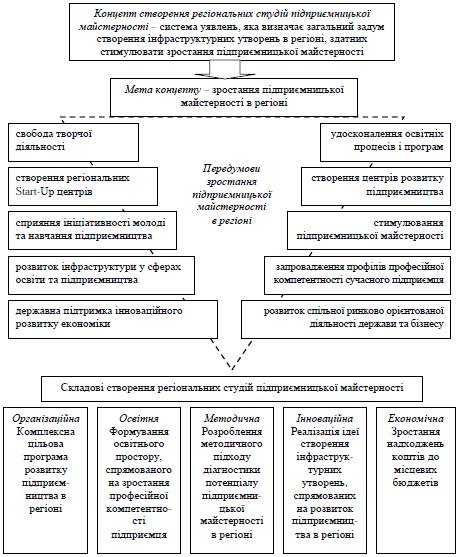 Концепт створення регіональних студій підприємницької майстерності є системою уявлень про мету, передумови і складові елементи (організаційну, освітню, методичну, інноваційну та економічну) створення інфраструктурних утворень, здатних стимулювати зростання підприємницької майстерності в регіоні. Управлінська складова створення регіональних студій підприємницької майстерності пов’язана з виконанням ключових функцій (організовування, планування, мотивування, контролю та регулювання), які забезпечують досяжність поставлених цілей та завдань регіонального та підприємницького розвитку на основі тісної взаємодії з освітніми та науковими інститутами.
