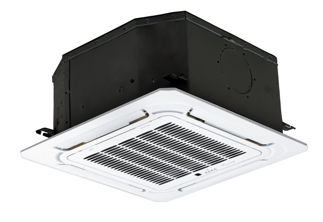 Кассетный кондиционер является разновидностью канального и встроен в подпотолочное пространство таким образом, что он подает воздух в нижнюю часть - сверху-вниз (рис.10,[10]). Нижняя часть кассетной сплит-системы имеет размер стандартной потолочной плитки 600х600 мм, а при большой мощности - 1200х600 мм, и закрывается декоративной решеткой с распределительными жалюзи.