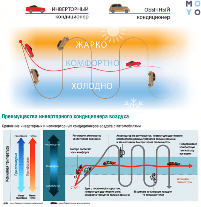 Климатическому устройству с инвертером нет необходимости каждый раз охлаждать весь объем воздуха в помещении, он лишь выдувает определенное количество воздуха для создания нужной температуры (рис.11,[11].).