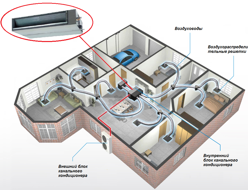 Забранный с улицы воздух по системе воздуховодов проходит через внутренний блок, где осуществляется его очистка и охлаждение (обогрев). Обработанный воздух через воздуховоды и отверстия вентиляции поступает в помещение.