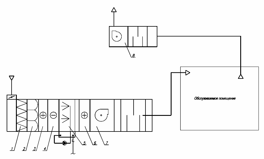 1 – воздушный фильтр грубой очистки; 2 – воздушный фильтр тонкой очистки; 3 – воздухонагреватель первого подогрева; 4 – воздухоохладитель; 5 – камера орошения; 6 – воздухонагреватель второго подогрева; 7 – приточный вентилятор; 8 – вытяжной вентилятор
