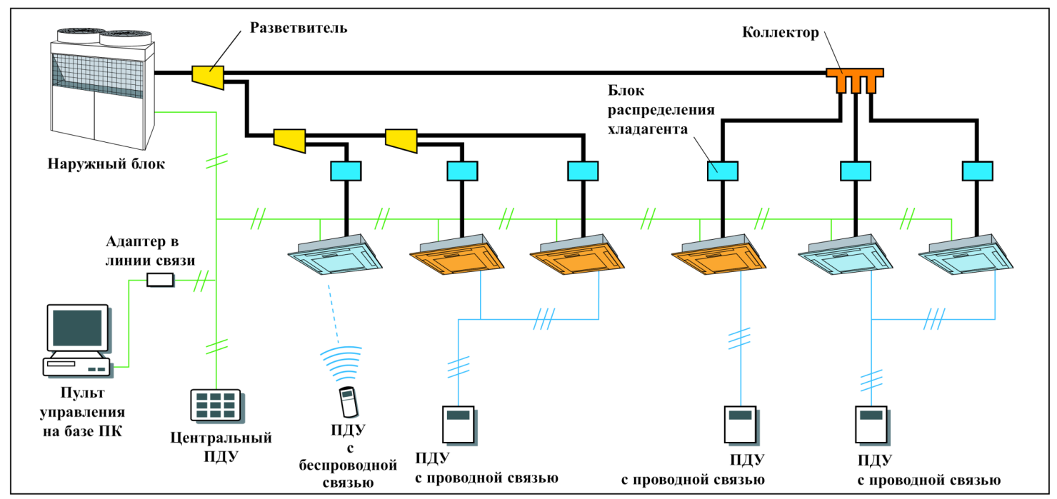 Кондиционеры с ПРХ могут включать в себя до 64 внутренних блока и до трех внешних [16].