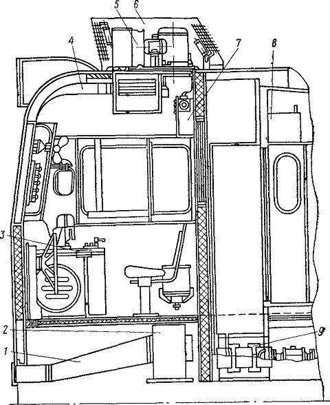 1- забор наружного воздуха, 2 - отопитель, 3 - пульт машиниста, 4 - выход охлажденного воздуха, 5 - вентилятор, 6 - обтекатель, 7 - пульт управления,