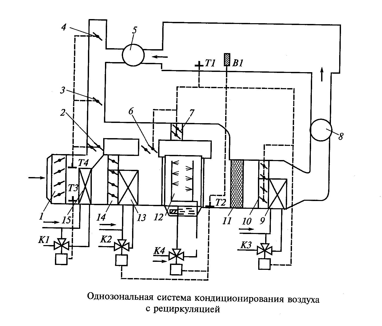 Воздух в помещение подается вентилятором 8, а удаляется вентилятором 5. Температура и влажность воздуха в помещении регулируются терморегулятором Т1 и влагорегулятором В1. Терморегулятор Т1 в летний период управляет исполнительным механизмом, перемещающим створчатые клапаны 6 и 7, а в зимний и переходный периоды - клапанов 10 и К3, изменяя температуру воды, поступающей на калорифер второго подогрева.