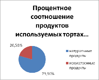 Мы провели анкетирование и выяснили, что большинство опрошенных из кондитерских изделий предпочитают торт. Также, мы узнали любимые начинки и добавки в торте, а так же что торты в большинстве случаев употребляют по праздникам. Большинство людей не знают о пищевых добавках, их вреде и пользы для организма. Люди предпочитают покупать торты в магазинах, чем готовить дома, но большее внимание обращают на цену.