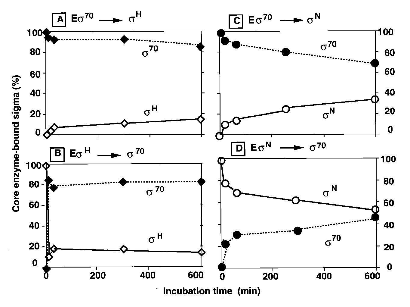 При насыщении порядок кор-фермент-связанных субъединиц σ составлял σ70 > σN > σF > σH/σFecI > σE > σS. В условиях насыщения σ доля холофермента Eσ70 составляла ∼39% от общего количества холоферментов. Отсюда мы заключаем, что в условиях конкурентного связывания в присутствии всех семи субъединиц σ сродство σ70 является самым сильным, а сродство σS-самым слабым. Судя по разнице сродства (>16 раз) в связывании кор-фермента между σ70 и σS и значению Kd = 0,26 нм для σ70 (см. выше), мы оцениваем, что кажущееся значение KD для σS с кор-ферментом составляет ≈ 4,3 нм (табл.1).