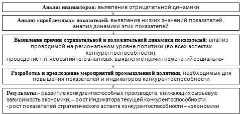 Следует отметить, что эффективность промышленной политики зависит от своевременного мониторинга процессов, происходящих в рамках социально-экономической системы. Для этого необходимо проводить на систематической основе комплексный анализ социально-экономических показателей, а также конкурентных преимуществ системы с целью выявления негативных тенденций в развитии, своевременного их устранения и стимулирования позитивных изменений в конкурентоспособности отраслевых и региональных социально-экономических систем.