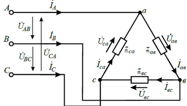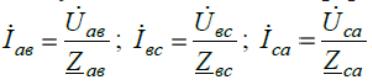 В линейных проводах А- a, B- в, C- c протекают линейные токи I A ,IB ,IC . В фазах приемника протекают фазные токи Iав ,Iвс ,Iса, определяемые по закону Ома в комплексной форме: