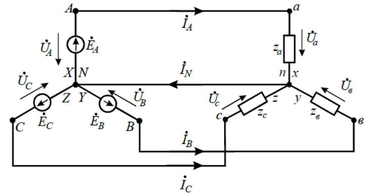 При несимметричной нагрузке Za ≠ Zb ≠ Zc между нейтральными точками приемника и источника электроэнергии возникает напряжение смещения нейтрали UnN.