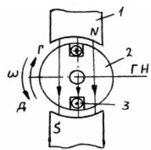 3 - проводники в пазах якоря.Неподвижная часть, на которой укреплены полюсы, называется статором или индуктором. Индуктор служит для создания основного магнитного поля машины. ГН - геометрическая нейтраль, линия, проходящая посередине между смежными полюсами.