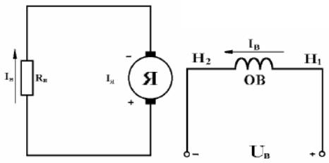 При независимом возбуждении обмотка возбуждения (ОВ) питается от независимого источника постоянного тока.
