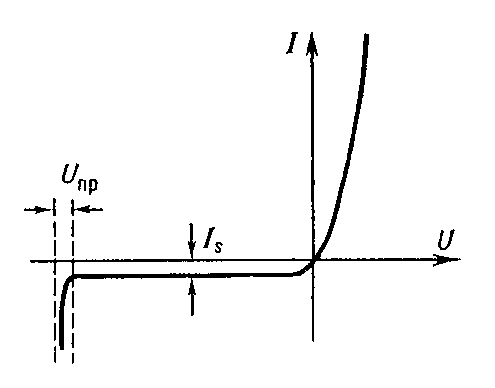 Рис. 2. Вольтамперная характеристика р — n-перехода: U — приложенное напряжение; I - ток через переход; Is — ток насыщения; Unp — напряжение пробоя.