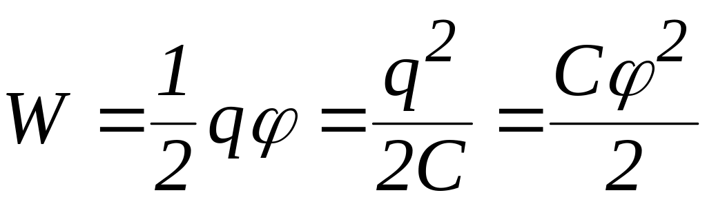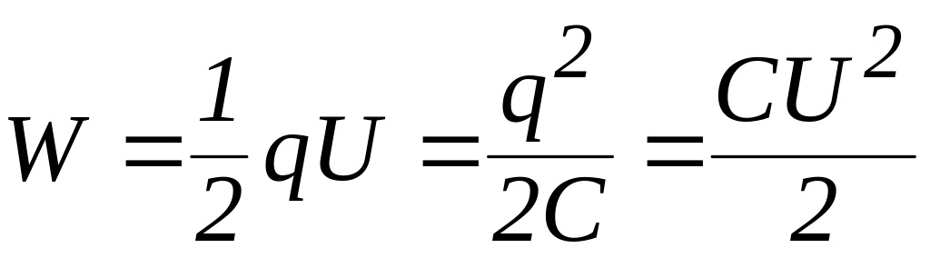 де q – заряд на одній з обкладинок, U – різниця потенціалів між обкладинками, С – електроємність конденсатора. Носієм енергії зарядженого конденсатора є електричне поле, утворене між обкладинками конденсатора.