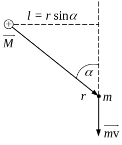 де l = r sin – довжина перпендикуляра, який опущено із точки О на пряму, вздовж якої рухається частинка. Ця довжина називається плечем імпульсу відносно точки О. Вектор перпендикулярний до площини рисунка і перетинає цю площину у точці О.