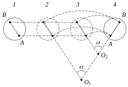 1) спочатку тіло рухається поступально з положення 1 до положення 2, а потім – обертально навколо осі О1 з положення 2 до положення 4;