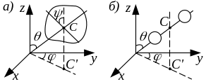 Система двох жорстко зв’язаних між собою матеріальних точок (двохатомна молекула) має п’ять ступенів вільності (xс , yс , zс , , ) (див. рис. 3.2, б). При обертанні навколо власної осі положення молекули не змінюється, тому необхідно задавати тільки два кути.