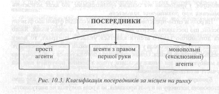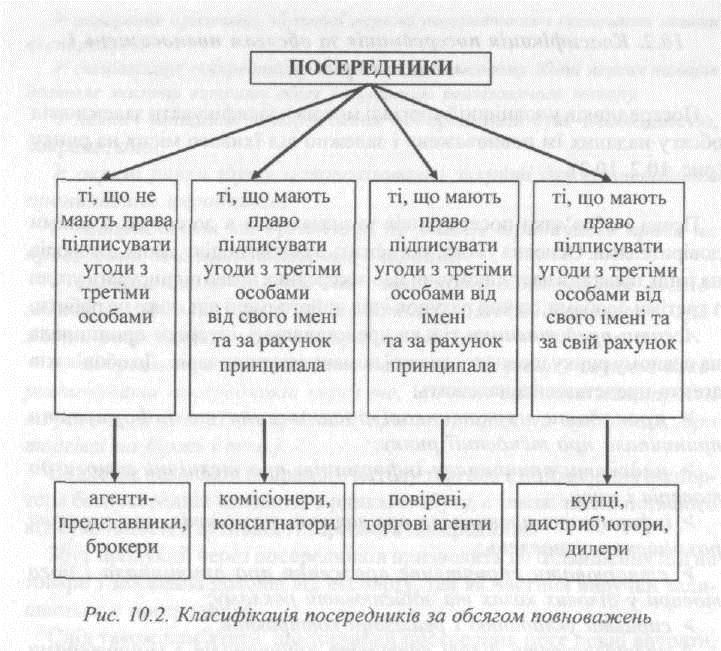 Посередників у зовнішній торгівлі можна класифікувати залежно від обсягу наданих їм повноважень і залежно від їхнього місця на ринку (рис. 10.2, 10.3).