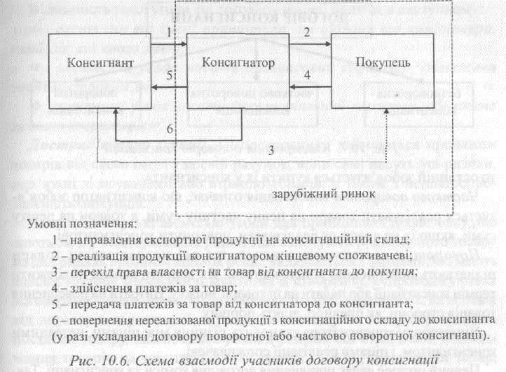 Агенти-консигнатори. За договором консигнації (різновид договору комісії) принципал (консигнант) поставляє товари на склад агента (консигнатора) для їх подальшої реалізації на ринку консигнатора. Консигнант є власником товару до моменту його реалізації. На умовах консигнації реалізуються товари масового попиту, і консигнатор здійснює платежі консигнанту по мірі реалізації товару. Загальна схема взаємодії учасників договору консигнації зображена на рис. 10.6.