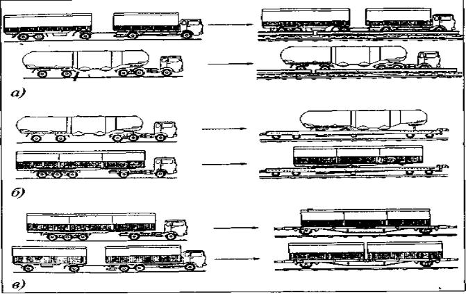 Рис. Системы контрейлерных перевозок (а-автопоезд, б-полуприцеп, в-съемный кузов