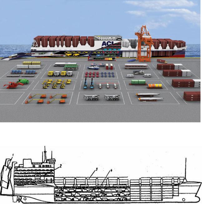 Рис. Судно типа Кон-Ро: 1- аппарель; 2 — автомобили: 3 — контейнеры; 4 — накатная техника