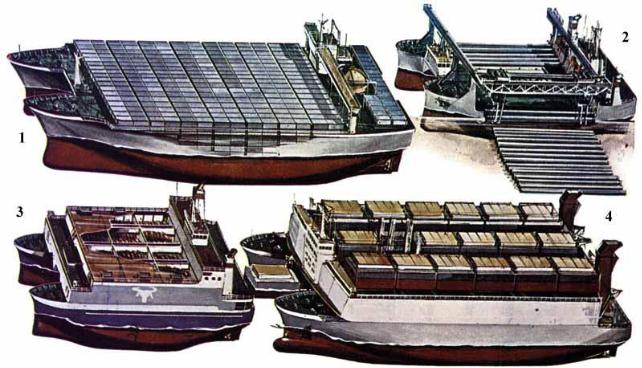Катамараны различного назначения 1 — контейнеровоз; 2 — трубовоз; 3 — судно для перевозки скота; 4 —