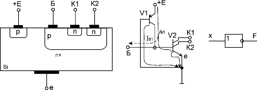 Ці недоліки подолані в ІС з інжекційним живленням. Ці схеми – насамперед логічні елементи, побудовані відповідно до принципу інжекційного живлення. Вони називаються інтегральною інжекційною логікою (ІІЛ або І²Л). Застосовуються в ВІС, зокрема у мікропроцесорах (серії К 582, К584). І²Л - елементи не мають аналогів у дискретних транзисторних схемах. За щільністю упакування вони перевищують навіть МОН-структури, а за рівнем розсіюваної потужності наближається до КМОН - структур. При цьому зберігається висока швидкодія, властива біполярним ІС. Основою І²Л елемента є схема рис. Елемент являє собою структуру, що складається з двох фізично об'єднаних транзисторів: горизонтального p-n-p і вертикального n-p-n. Емітерна область p-n-p транзистора називається інжектором і підкладається до позитивного полюса джерела живлення (+Е). Від одного інжектора можуть живитися декілька схем. Вертикальний n-p-n транзистор має кілька колекторів, які служать вихідними виводами логічного елемента. Особливості конструкції: спільна область n – типу є водночас базою p-n-p транзистора та емітером n-p-n транзистора і підключається до корпуса; спільна область p – типу служить колектором p-n-p транзистора і базою n-p-n транзистора. За такої фізичної структури не потрібна ізоляція між окремими елементами І²Л, оскільки вони мають спільну n – область. Через це досягається висока щільність упакування (10000 елементів на кристалі). Весь елемент займає площу, що дорівнює площі одного багатоемітерного транзистора. Зображений на рис. типовий елемент І²Л – це логічний елемент НІ (ключ – інвертор).