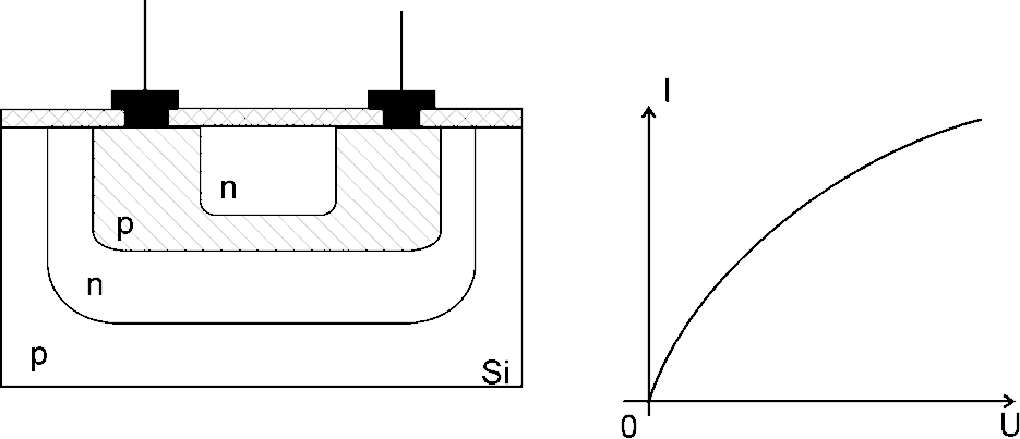У напівпровідникових ІС застосовуються і т. зв. квазілінійні резистори на МДН – транзисторах з індукованим каналом (рис.). У них використовується ділянка вихідної (стокової) характеристики до настання перекриття каналу. Змінюючи величину напруги Uз, ми перестроюємо квазілінійний резистор. Опір таких елементів набуває значень від сотень Ом до десятків кОм.