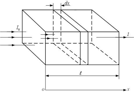 Cвітло з інтенсивністю I0 яке падає на тіло товщиною l частково відбивається від границь розділу середовищ (рис.). З урахуванням відбиття від першої поверхні у зразок пройде випромінювання з інтенсивністю (1 - R)I0. Внаслідок поглинання у шарі товщиною dx інтенсивність випромінювання I зменшиться на величину dI. Кількість поглиненої енергії dI пропорційна кількості енергії I що падає і товщині поглинаючого шару dx -dI = Idx