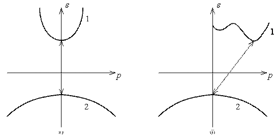 Відомі в наш час напівпровідники у відповідності з конфігурацією зон поділяють на два основні види. У першому з них мінімум енергії в зоні провідності, який характеризується хвильовим вектором kмін і максимумом енергії у валентній зоні kмакс розташовані у одній тій самій точці зони Брилюєна (звичайно у точці k = 0). Такі напівпровідники називаються прямозонними (GaAs, InSb, CdTe). У іншого виду напівпровідників екстремуми зони провідності і валентної знаходяться при різних значеннях k. Такі напівпровідники називаються непрямозонними (Ge, Si). Оскільки екстремуми зон зміщені за k, то перекидання електрона під дією фотона відбувається зі зміною вихідного значення квазіімпульса. Для цього потрібне третє тіло – фонон, який забере частину імпульсу на себе. Такі переходи менш ймовірні.