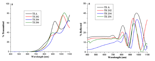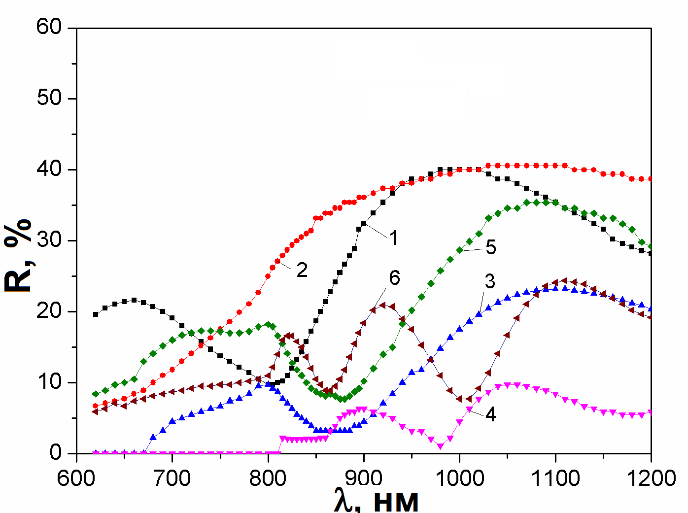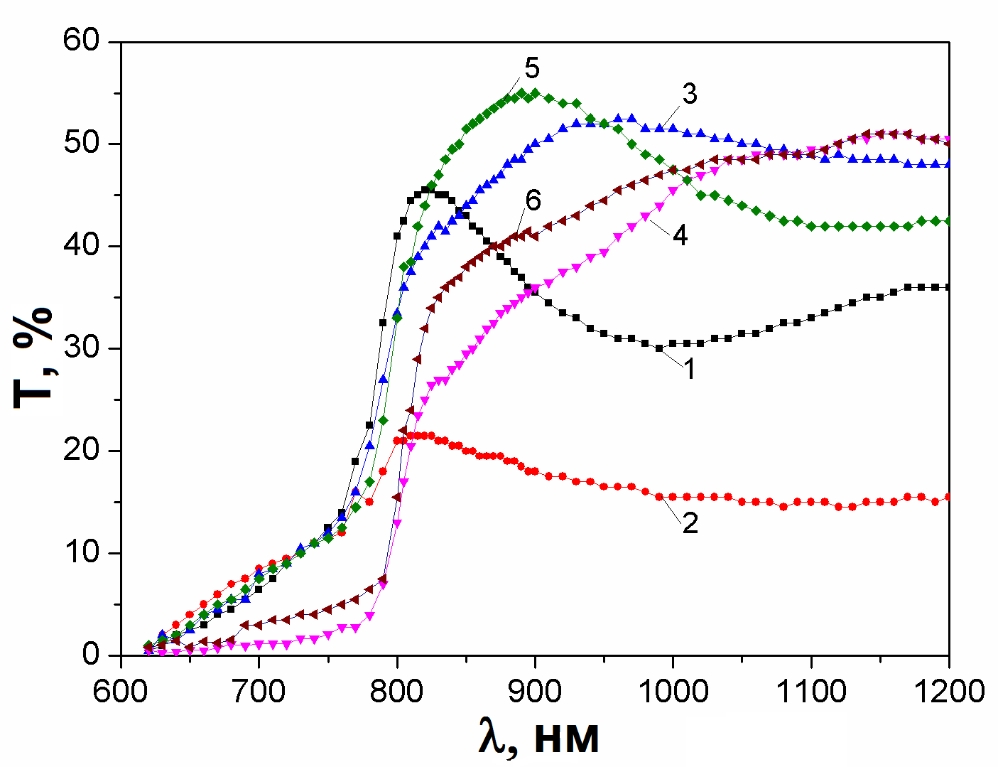 Спектри пропускання (а) та відбиття (б) плівок CdТe, отриманих при Te = 893 K та різних температурах підкладки Ts, K: 293 (1); 373 (2); 473 (3); 573 (4); 673 (5); 773 (6).