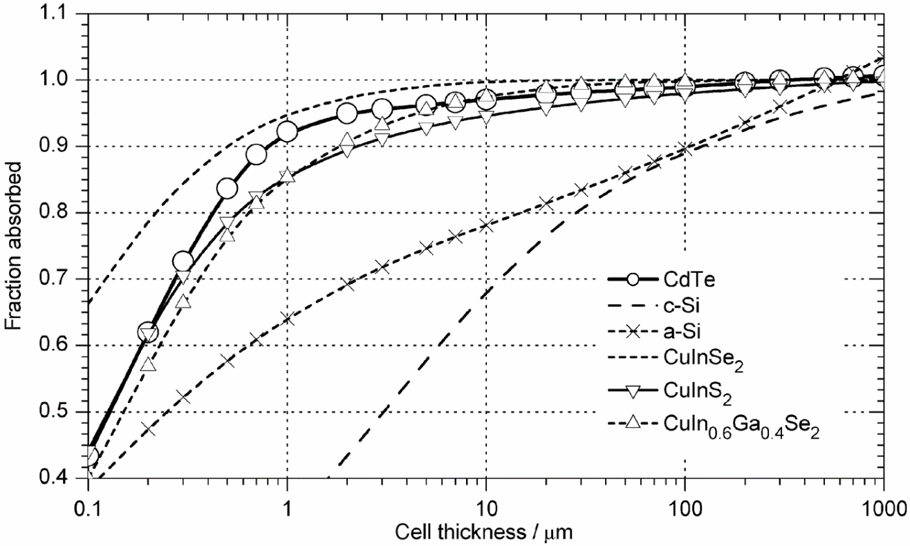 Прямозонні матеріали поглинають 90% падаючого світла на товщині 1-3 мкм, непрямозонні на 100-150 мкм. Для того, щоб поглинути 100% світла, шар кремнію повинен мати товщину104 мікрон, в той час коли, наприклад, шар CdTe (CIGS) – лише 4-5 мікрон