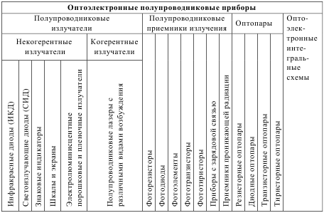 Оптоелектронні напівпровідникові прилади (ОПП) ділять на випромінювачі, приймачі випромінювання, оптопари і оптоелектронні ІМС (табл. 1).