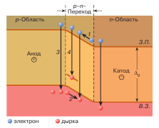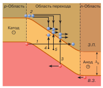 на р-n-переході: 1 - потік електронів, 2 -