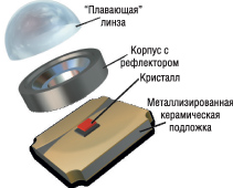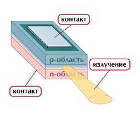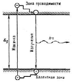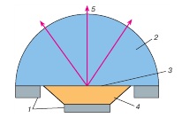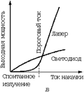 Основний фізичний процес, що забезпечує роботу світлодіодів – це випромінювальна рекомбінація у базі, ймовірність якої зростає при підвищенні концентрації неосновних нерівноважних носіїв, тобто при прямому ввімкнені – переходу. Ця рекомбінація, на відміну від невипромінювальної, супроводжується виділенням енергії у вигляді квантів світла. Для виготовлення світлодіодів застосовують матеріали з малою ймовірністю невипромінювальної рекомбінації (наприклад, сполуки InSb, GaSb, GaAs, GaP, InP, SiC тощо). Свічення збуджується в інфрачервоному і видимому діапазонах за допомогою змінного або постійного струму при напрузі U>Uпор, де Uпор UК (порогова напруга дорівнює контактній різниці потенціалів). Будова світлодіоду показана на рис. 1. Для підвищення ККД (зменшення відбиття) випромінювальна поверхня виконується у формі напівсфери. Яскравість свічення майже лінійно залежить від струму через світлодіод (рис. 2).