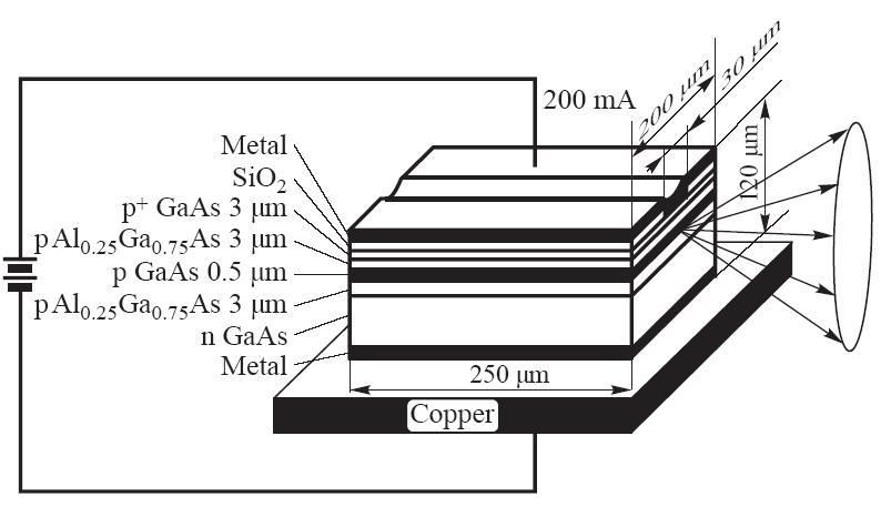 У лазері на діоді напівпровідниковий кристал виготовляють у вигляді дуже тонкої прямокутної пластинки. Така пластинка по суті є оптичним хвилеводом, де випромінювання обмежене у відносно невеликому просторі. Верхній шар кристала легується для створення n-області, а в нижньому шарі створюють p-область. В результаті утворюється плоский p-n перехід великої площі. Дві бокові сторони (торці) кристала поліруються для створення гладких паралельних площин, які утворюють оптичний резонатор, названий резонатором Фабрі-Перо. Випадковий фотон спонтанного випромінювання, що випромінюється перпендикулярно цим площинам, проходить через оптичний хвилевід і кілька разів відбивається від торців, перш ніж вийде назовні. Проходячи вздовж резонатора, він буде викликати вимушену рекомбінацію, створюючи нові і нові фотони з тими ж параметрами, і випромінювання посилюватиметься (механізм вимушеного випромінювання). Як тільки посилення перевищить втрати, почнеться лазерна генерація. Це відповідає пороговому струму інжекції. Одномодові лазери застосовуються в оптичних запам'ятовуючих пристроях, лазерними вказівками, а також в волоконної техніці.