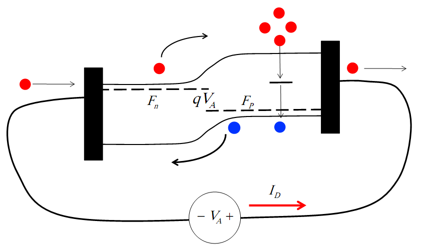 Кожного разу, коли неосновний носій-електрон рекомбінує на р-стороні, один електрон протікає у зовнішньому колі