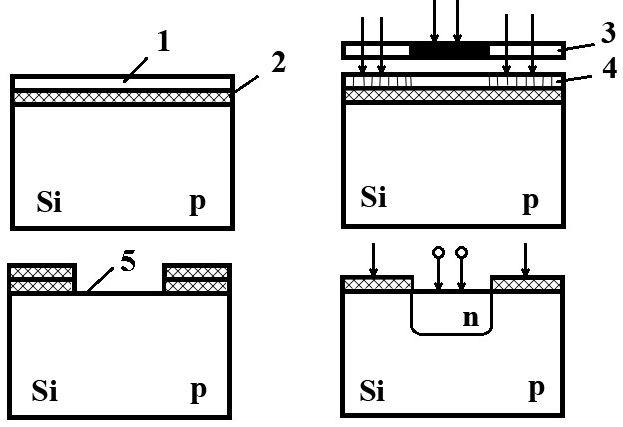 На кремнієвому кристалі (рис.) створюється тонкий шар двоокису SiO2. На нього наноситься шар 1 фоторезиста. Це речовина, яка під дією опромінення стає кислотостійкою. Фоторезист опромінюється ультрафіолетовими променями через фотошаблон 3 (фотопластинка з відповідним рисунком із прозорих і непрозорих ділянок). Опромінені ділянки 5 витравлюються травником. Цей процес називається фотолітографією. На ділянках 5 утворюються вікна, через які здійснюється процес дифузії донорних атомів із нагрітого газу 6.