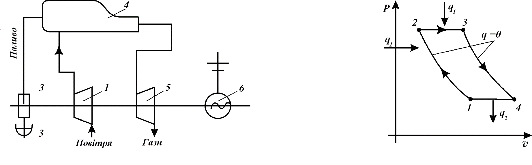 Процеси циклів: 1-2 – адіабатне стискування|стиснення| повітря у відцентровому компресорі 1; 2-3 – по ізобарі , або по ізохорі , горіння палива|пального| в камері згорання|згоряти| 4, підведення теплоти в циклі; 3-4 – адіабатне розширення димових газів на лопатках робочого колеса газової турбіни 5. Здійснення роботи у вигляді обертання ротора електрогенератора 6 і вироблення електроенергії; 4-1 – ізобарний вихлоп газів, відведення|відвід| теплоти в циклі.