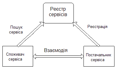 Основу архітектури, орієнтованої на сервіси, становить взаємодія трьох учасників: