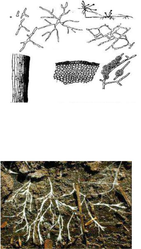 Ризоморфи - потужні, гіллясті, темні з поверхні стрічки (у опеньок та ряду базидіальних грибів ризоморфи можуть досягати декількох метрів в довжину