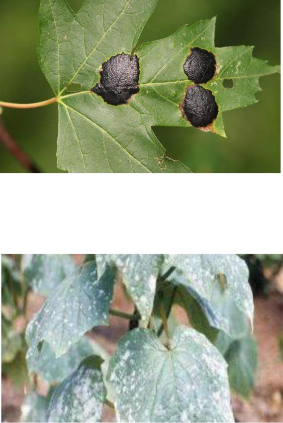 дмирання тканини або частини органу рослини. Наслідком некрозів є плямистості, які проявляються у вигляді ділянок відмерлої тканини на уражених органах. Плями істотно варіюють по забарвленню і формі, але найбільш поширені округлі, іноді з руйнуванням центральної частини та з утворенням в листках отворів (рис.1.4.1).