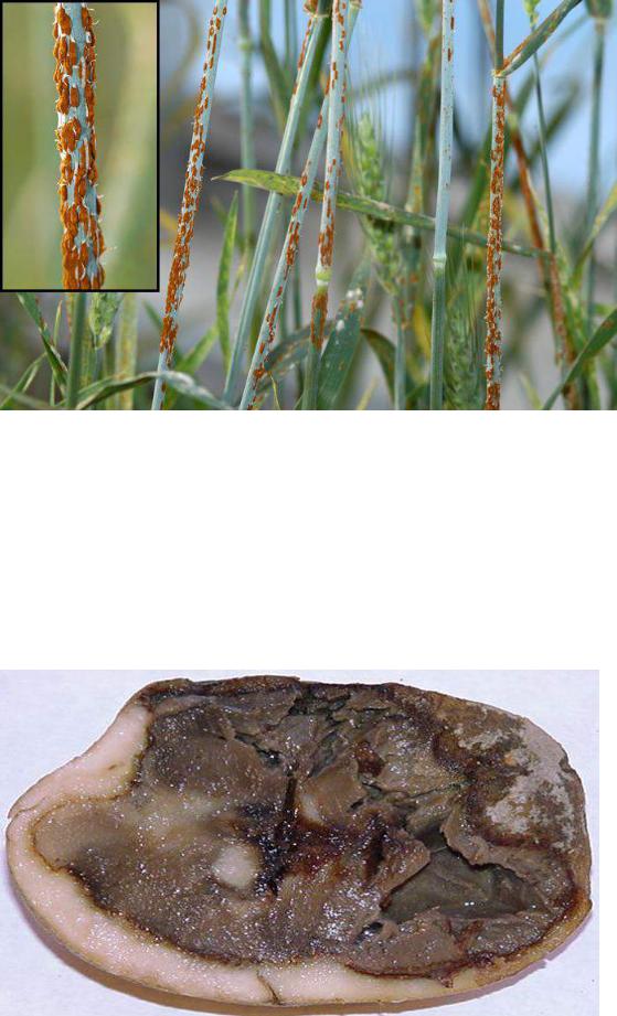 Гнилі. Цей тип прояву хвороби найпоширеніший (рис. 2.1.3). Існують м’які та тверді, мокрі (мокра бактеріальна гниль картоплі) та сухі гнилі (фомозна гниль моркви, фузаріозна гниль картоплі, гнилі деревини викликані трутовими грибами). Ферментативна діяльність грибів та бактерій руйнує міжклітинну речовину, викликаючи мацерацію (розпад тканин). Вподальшому відбувається руйнація клітинних оболонок, вивільняється клітинний сік супроводжуючись мокрим гниттям. Гниття нерідко супроводжується неприємним специфічним запахом (рис.1.4.5).