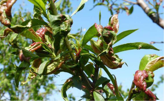Рис. 1.4.8. Курчавість листків персика викликана голосумчастими грибами
