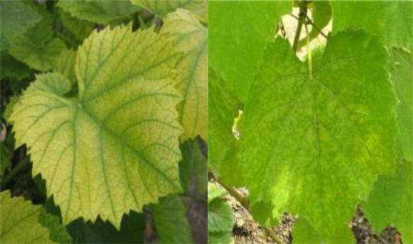 Нестача заліза проявляється у вигляді хлорозу листків головним чином на багаторічних рослинах - яблуні, груші, винограді. Спостерігається побіління та пожовтіння листків, зазвичай верхівкових; при сильному хлорозі може пожовтіти все листя, яке пізніше засихає та опадає. Збереження зеленого забарвлення впродовж головних жилок листка - характерна ознака, яка відрізняє залізний хлороз від інфекційного вірусного хлорозу на винограді (рис.2.3.1).