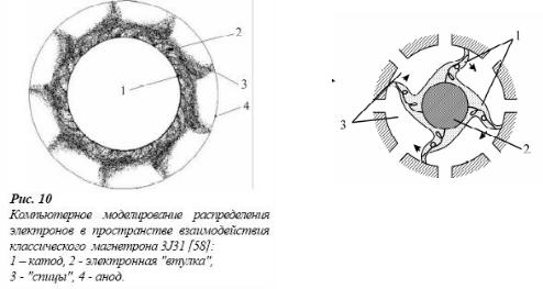 Якщо магнітне поле відсутнє, то траєкторія електронів співпадає із напрямом силових ліній електростатичного поля, що якісно відображається випадком 1 на рис. 15а. Рух електронів під дією магнітного і електричного полів описується рівнянням Лоренца (випадки 2-4 рис.15а) і відбувається по епіциклоїдам, тобто по кривих, які описує точка кола, що котиться по поверхні катода. Середня швидкість руху електронів визначається відношенням напруг електричного і магнітного полів.