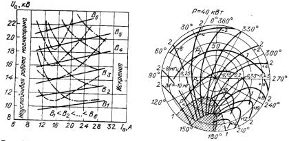 Робочі характеристики магнетрона (рис. 17) побудовані для фіксованих значень індукції магнітного поля В при заданому Kст навантаження. З робочих характеристик видно, що при малій анодній напрузі анодний струм в магнетроні відсутній, тобто майже всі електрони, що вилетіли з катода, повертаються назад на катод. При деякому значенні анодної напруги, коли виконується умова синхронізму ve= vф, в магнетроні збуджуються інтенсивні коливання. У цій області при незначному збільшенні анодної напруги різко зростає анодний струм. При збільшенні напруженості магнітного поля інтенсивні коливання в магнетроні збуджуються при вищій анодній напрузі.